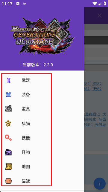 4、然后点击左上角的【三】按钮可以在这里切换频道,如【武器,装备,道具,猎猫,技能,怪物,地图等】。
