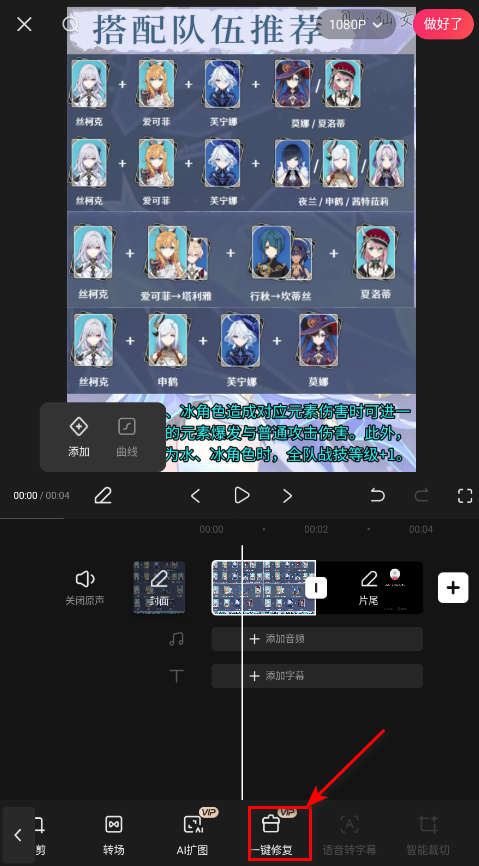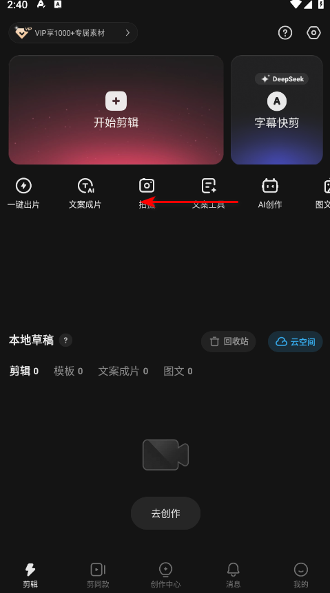 4、通过下方的不同按钮对视频进行剪辑:剪辑、素材、调整、音效、字幕。