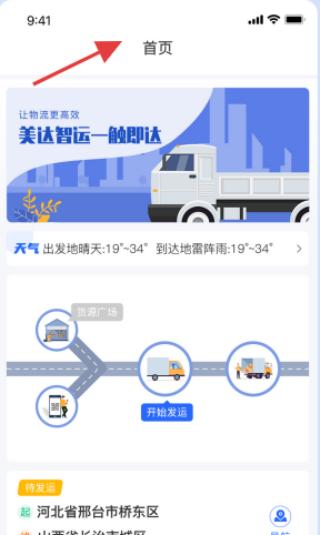 1、点击首页,美达智运一触即达,展示出发与到达地天气,设有开始发运按钮,开启物流操作。