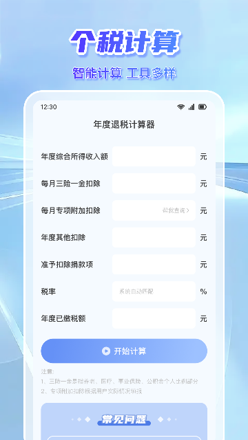 3. 计算个税:进入“年度退税计算器”页面,填写收入、扣除项等信息,点击“开始计算”获取退税金额;
