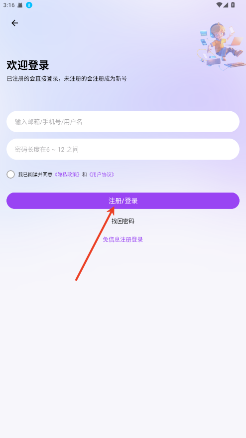 2.输入自定义用户名以及密码点击注册/登录即可。