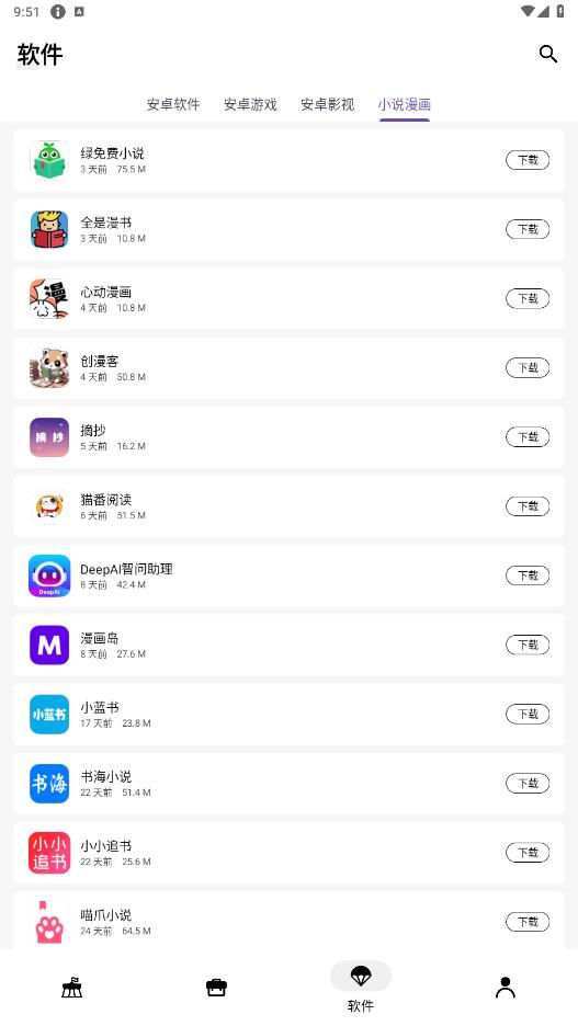 7.软件界面提供了安卓软件,安卓游戏,安卓影视,小说漫画找资源,点击资源查看详情
