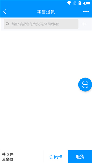 3、输入商品名或助记码、条码后6位,如果有使用会员卡的付款的输入手机号后,点击退货即可,