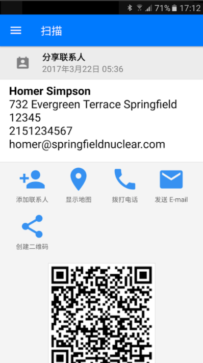 其他选项: 创建QR, 扫描影像, 从图库扫描, 通过QR分享您的联系信息