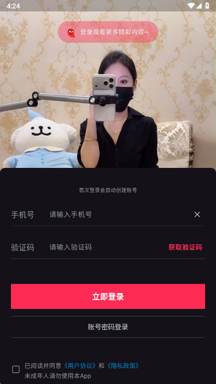 2.如下图所示,可以看到本软件支持两种登录方式,第一种是输入手机号和验证码,接着勾选已阅读并同意《用户协议》和《隐私政策》,点击立即登录即可,第二种方式是输入账号和密码进行登录,大家可以自由选择哈。
