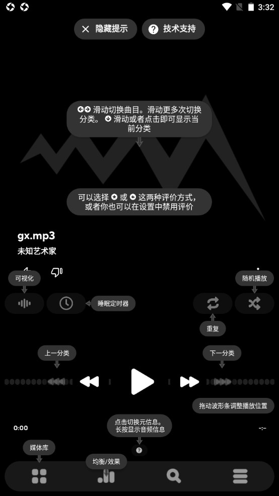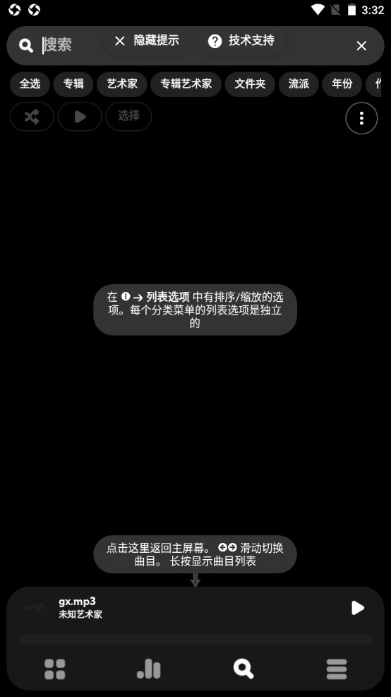 1、这里是Poweramp的主界面,你可以在这里完成滑动切换曲目、滑动更多次切换分类等操作,你还可以通过滑动或者点击来显示当前分类。