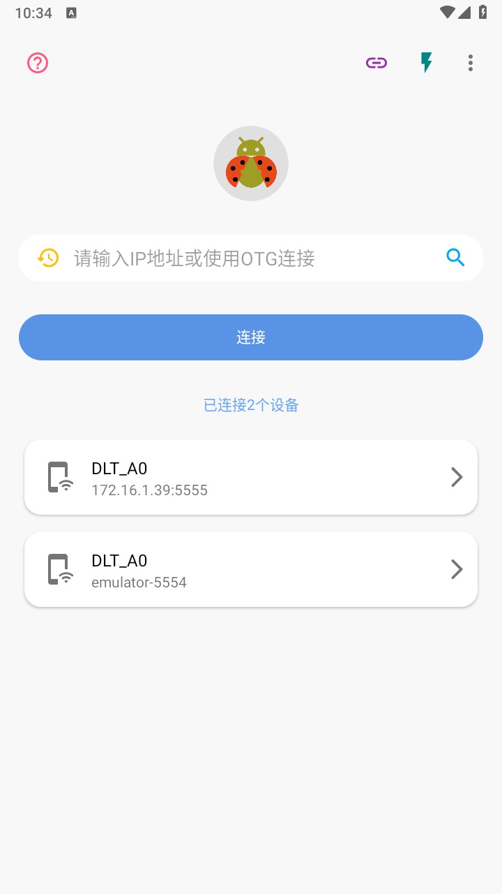 7.如果我们有OTG转接头,请打开甲壳虫 ADB 助手软件,用数据线+OTG连接两部手机。
