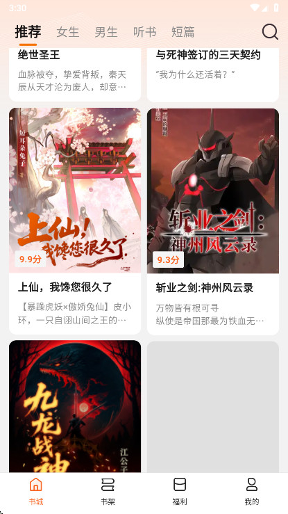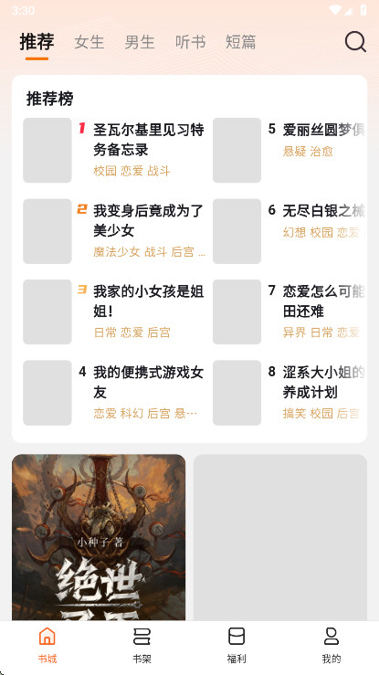 2、“书城”页面汇集了很多的小说类型,言情、古装以及都市等。