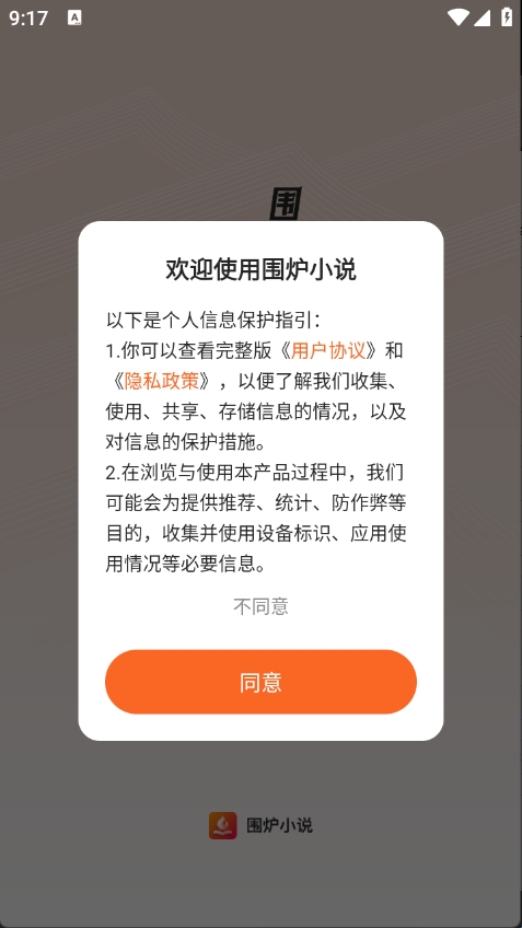 1、首先请在本站下载围炉小说app,点击同意隐私政策与用户协议。