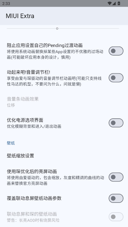 miui extra作为一款基于LSPosed框架的开源系统扩展模块,它的功能深入到了系统的毛细血管里。首先是视觉上的华丽蜕变:它不仅支持修改全局壁纸的缩放比例和淡入淡出动效,还能让你自定义解锁动画,告别千篇一律的开机效果。在操作体验上,它能优化系统的小白条手势提示线,支持沉浸模式和自动透明,让屏幕视野更完整。