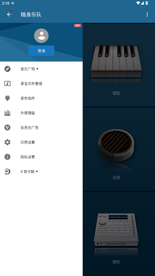1.用户们在随身乐队里,可以直接通过首页的“多音轨合成器”,合成和调整手机里的音频文件,或者使用直接用手机来演奏录制“架子鼓”、“吉他”等乐器。