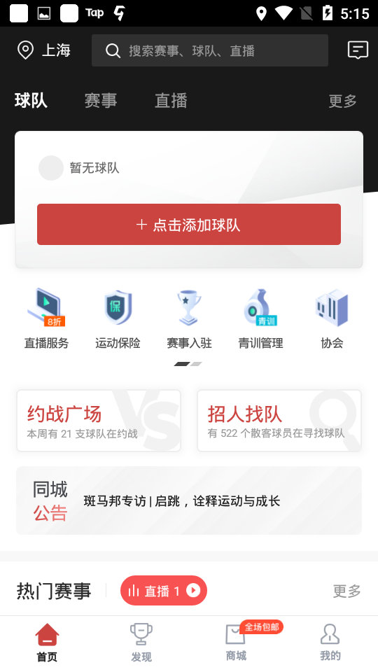 1、打开app并进入首页,在上方有很多的功能:直播服务、运动保险、赛事入驻、青训管理、装备定制,点击“找人找队”。