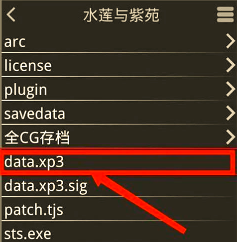4、进入【游戏文件夹】后,会看到一系列的游戏名称及相关选项。在此,我们需要找到并选择【data.xp3】这一选项。