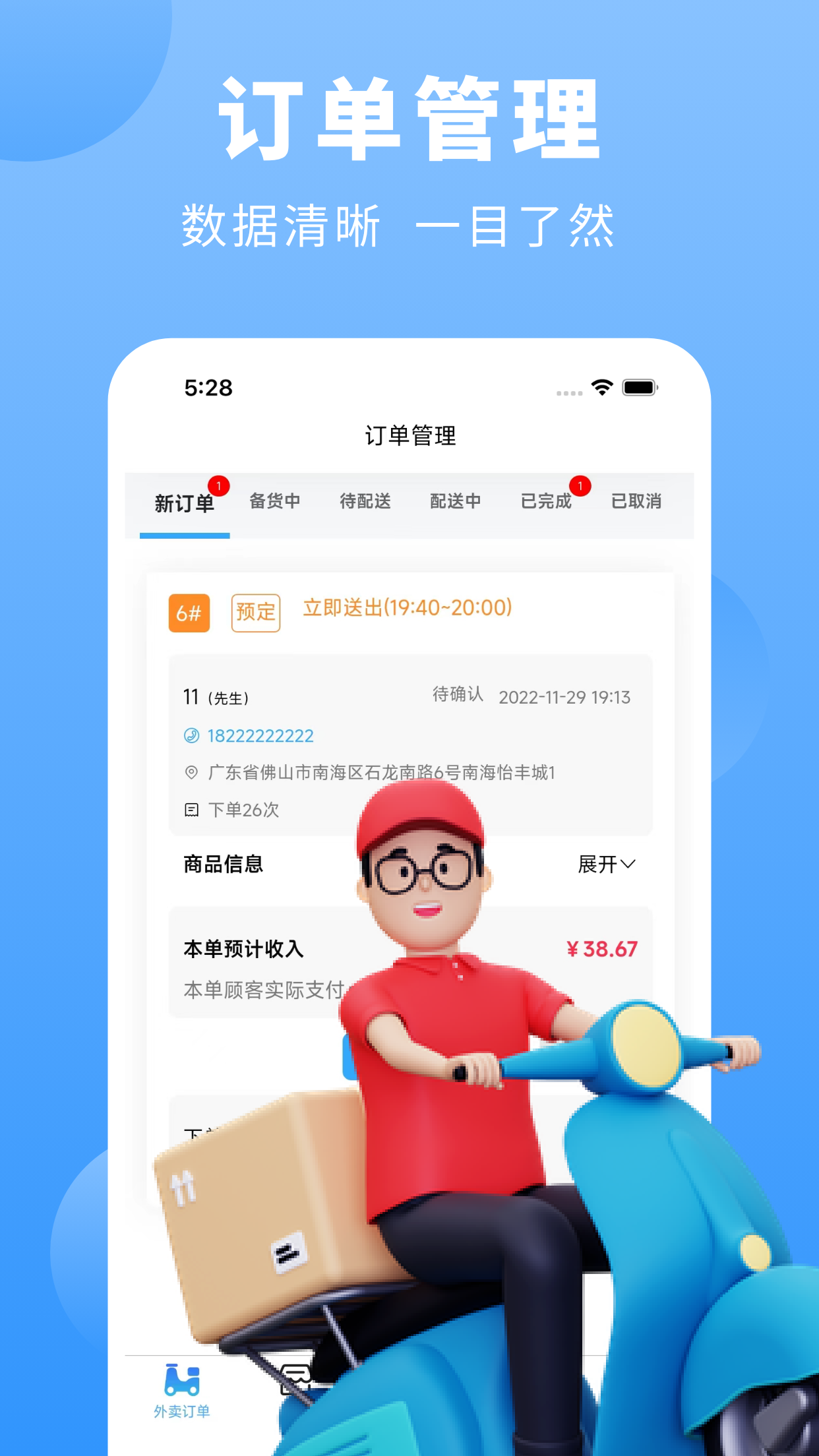 订单配送:随时随地接单,同步订单状态、通知配送员,处理改价/取消等售后