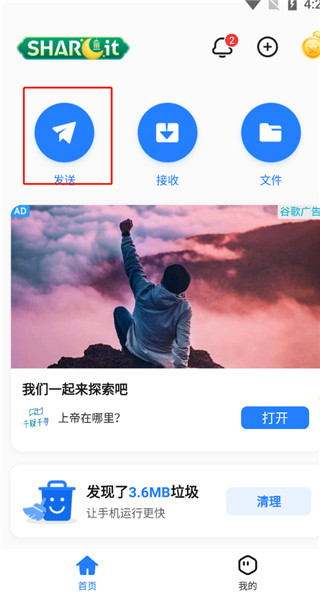 1、打开茄子快传精简版,进入首页,发送照片的一方可以点击我要发送;