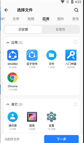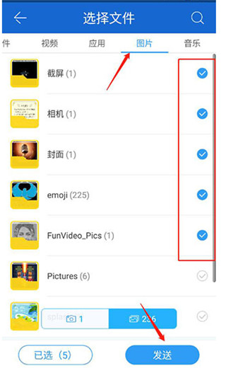 3、点击我要发送后可以在这里选择你要发送的内容,可以发送文件、视频、应用、图片、音乐;