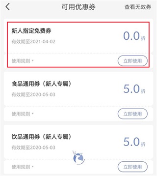 然后在我的-优惠卷-打开,查看新人指定免费卷,点击立即使用。