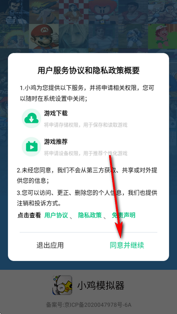 1、先在本站下载最新版本小鸡模拟器极速版安装好,打开后先同意协议和隐私政策。