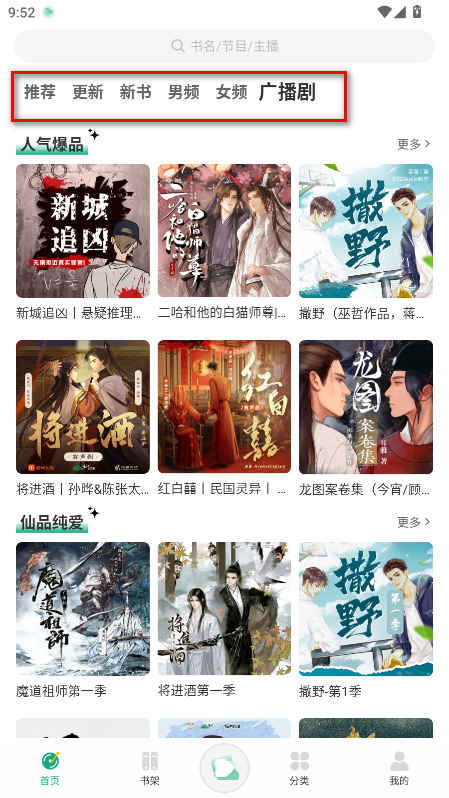 1.请在本站下载安装并打开小梨听书,可以看到首页上方有着推荐、最新、新书、男频、女频、广播剧等板块内容。