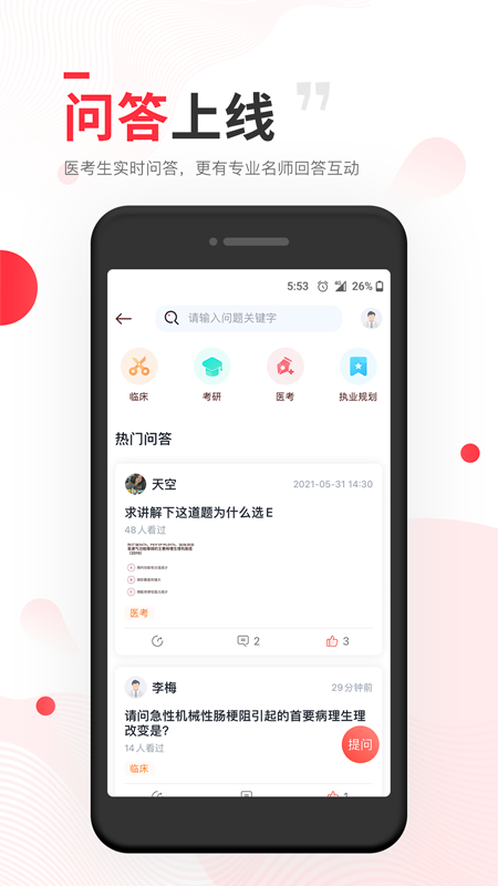 7、【在线题库】,拥有海量精品试题;集中了章节练习、模拟考试、错题重做、模考大赛等模块,提供自动阅卷评分以及试题解析等多功能服务,提供全国真题与考试练习,专项练习,各个击破。记录用户练习情况,生成数据报告,预测考分。是医考考生顺利通过考试的好帮手!