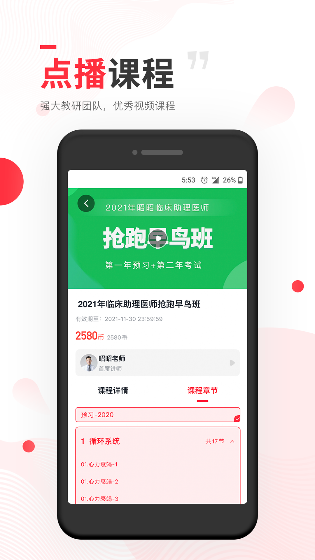 昭昭医考app最新版是为广大的医学生们准备的医考复习软件,海量优质的视频课程学习资源,专业权威的医考老师在线辅导帮助大家轻松的掌握医考相应的难点和知识点,在昭昭医考还有详细的医考相关资讯实时为你提供,这里为各位考生们收录了近年来的医考真题全解,方便大家通过反复的练习来提高自己的学习效果,轻松的通过医考取得资格证书,有需要的赶紧来本站下载学习吧。