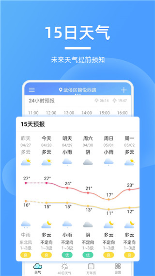 轻松查阅24小时内天气变化,日出日落,提早预防早晚温差过大。