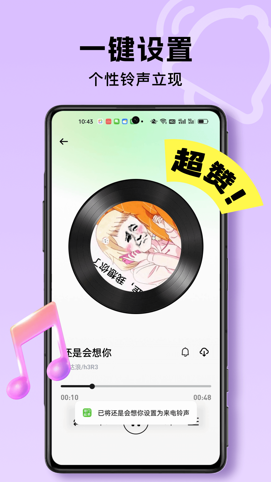 2、支持试听后直接设置为手机来电或通知铃声,无需跳转其他应用或界面,一键即可完成个性化铃声设置,便捷高效。