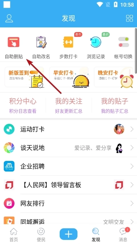 2、在发现板块中,有各种社交类的服务,如谈天说地、网友排行、同城邂逅等