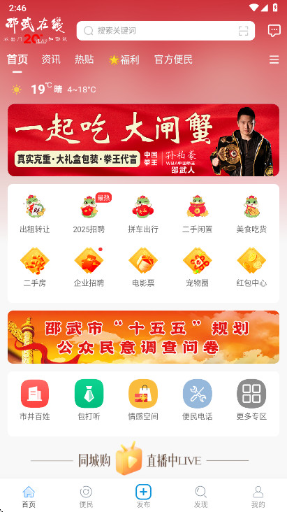 3、在便民板块中有生活类的服务,如求职招聘、美食吃货、平安邵武等