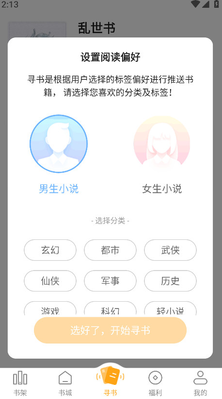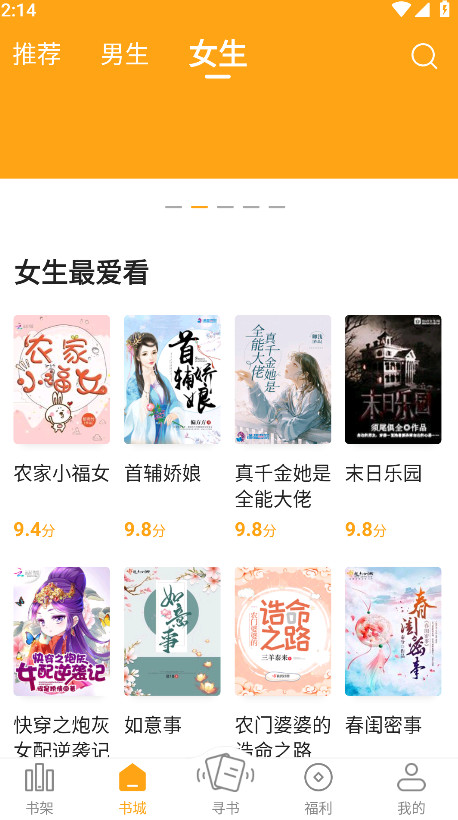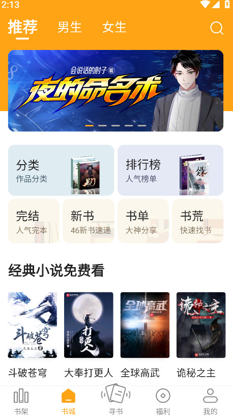 8.点击下方的书城,可以看到分为推荐、男生、女生三大板块内容,每一个板块都会有详细分类的小说资源哈。