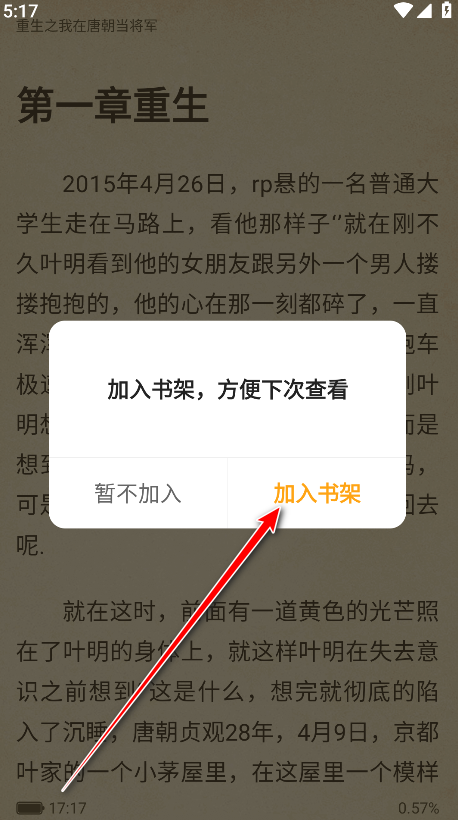 7.比如我们看累的时候,点击手机上的返回按钮,再点击加入书架,即可方便下次查看了。