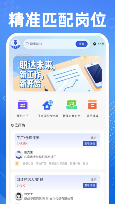 1、首页汇集随机推荐、公积金计算、社保方案对比、简历模板等实用工具,并可直接查看职位详情。