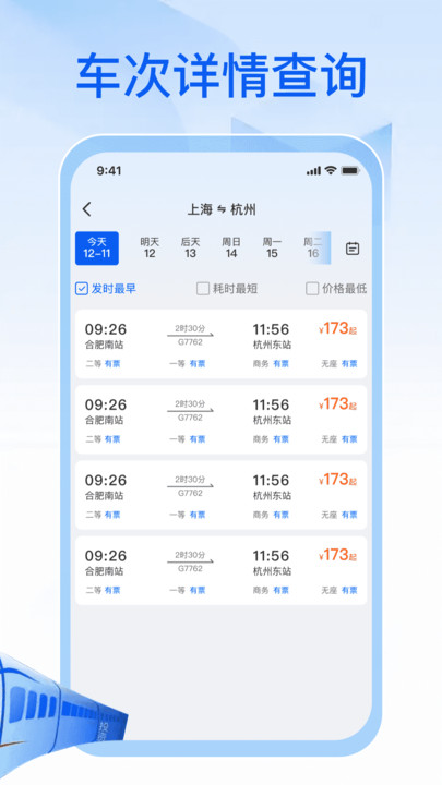 3、实时查询火车、高铁班次,支持按时间、时长、价格筛选并完成在线预订。