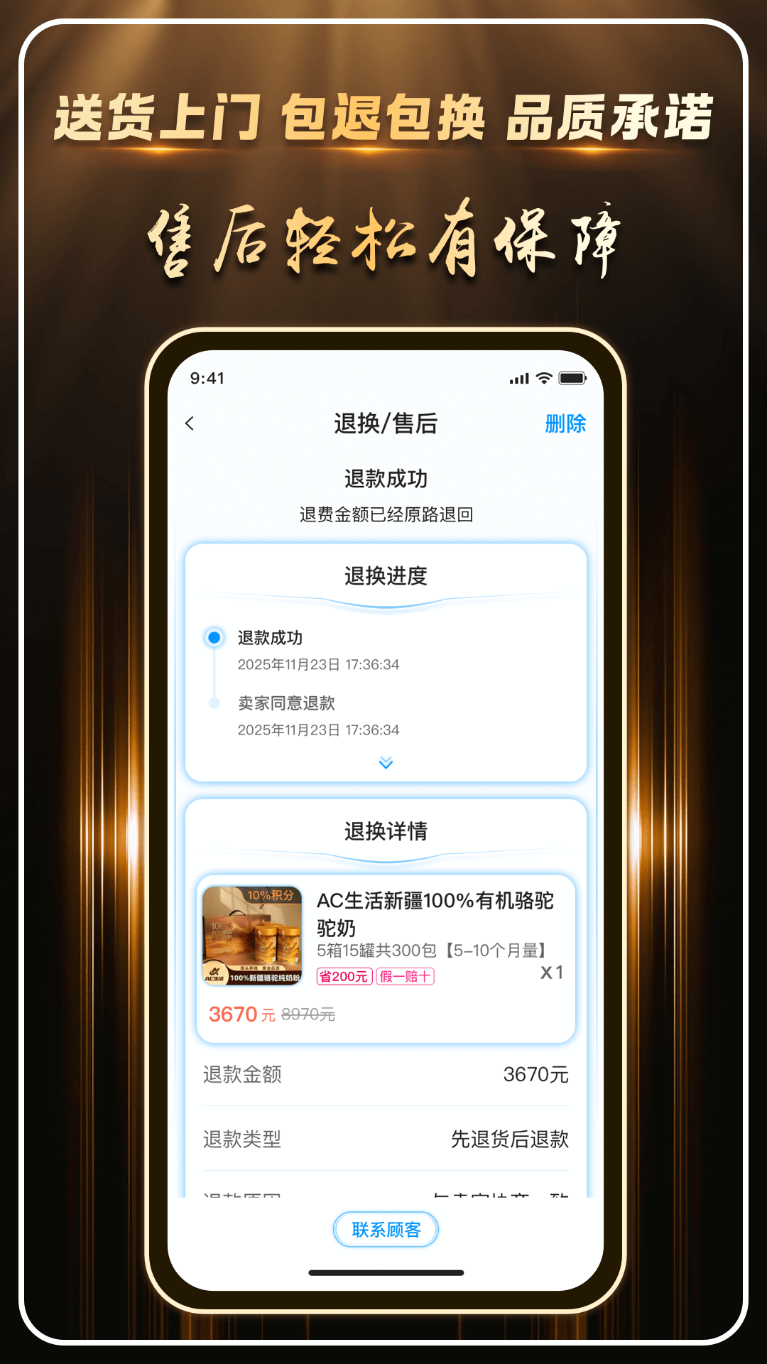 4、在线提交退换货申请、查看售后政策,并享受由平台自营提供的快速售后响应处理。