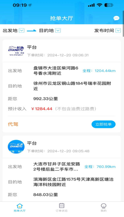2、接单大厅内置订单筛选功能,司机可根据行程距离、预估收益、接单方向等维度自主筛选订单。