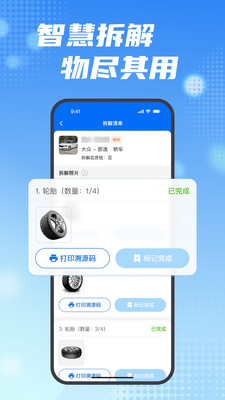 1、是报废车行业的移动办公管理助手,整合采购、质检、拆解等全流程功能,帮助企业实现数字化高效运营。