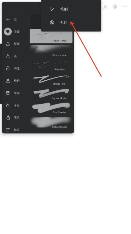 添加笔刷:按图中“+”,→“社区”社区分享或 “+笔刷”自制。