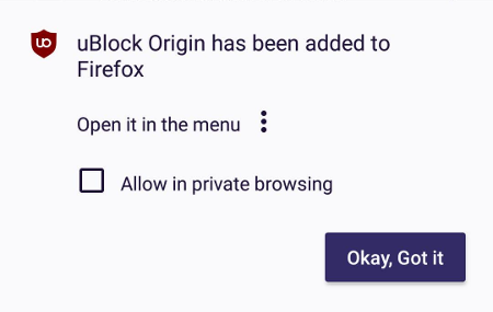 安装扩展之后,Firefox 会让你在隐私浏览模式启用。你可以马上勾选 允许在隐私浏览模式使用,也可以以后再启用(见下)。