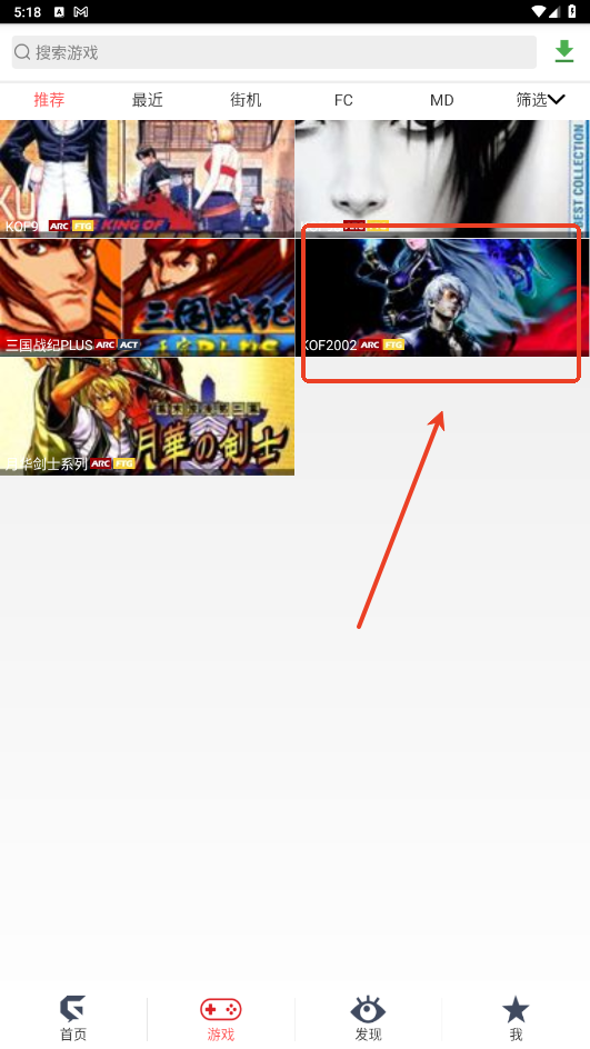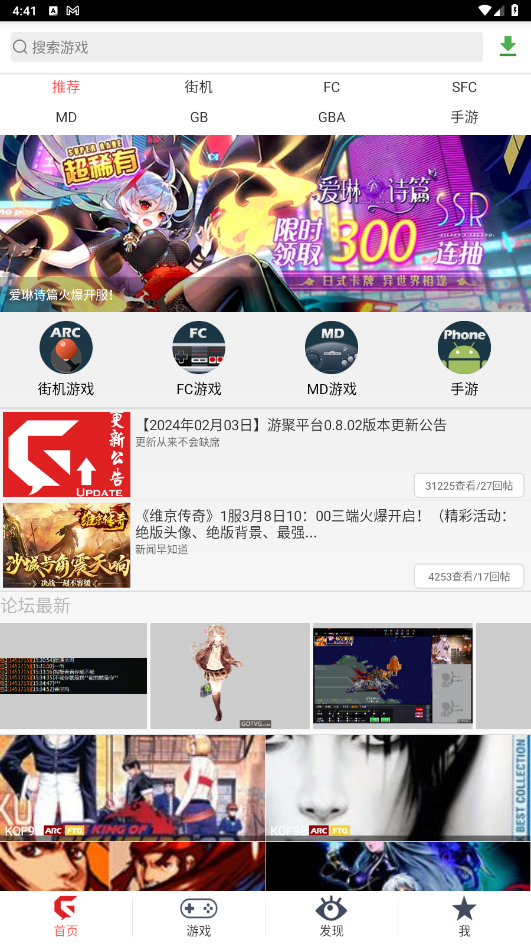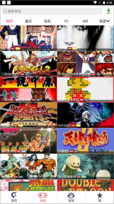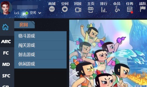 2、进入首页后界面如下,可以看到各类游戏,如:街机游戏、fc游戏、md游戏等等;