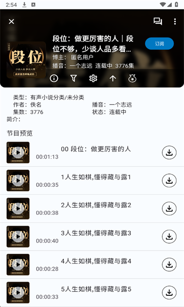 3、可以将喜欢的有声小说收藏订阅,还提供了节目预览、下载等操作。