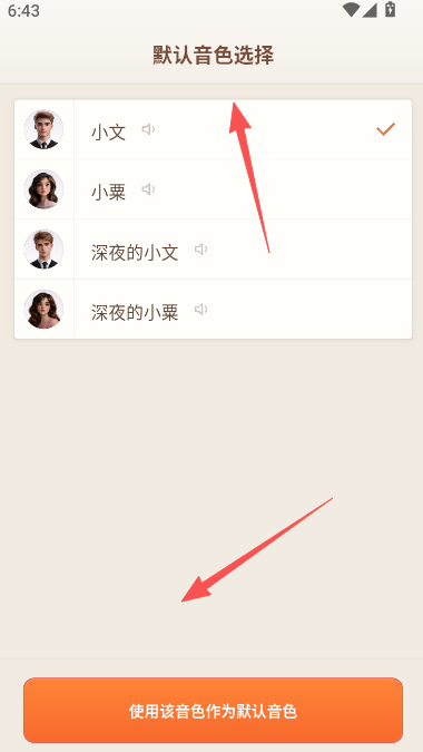 3、选择你要用到的朗读音频智能体,点击下方选项作为默认音色。