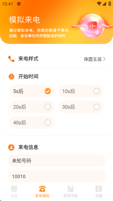 4.在应用底部导航栏中选择“来电模拟”选项,进入模拟来电设置页面,可设置来电样式、开始时间(如5秒后)、来电号码等参数,用于在需要时模拟来电。