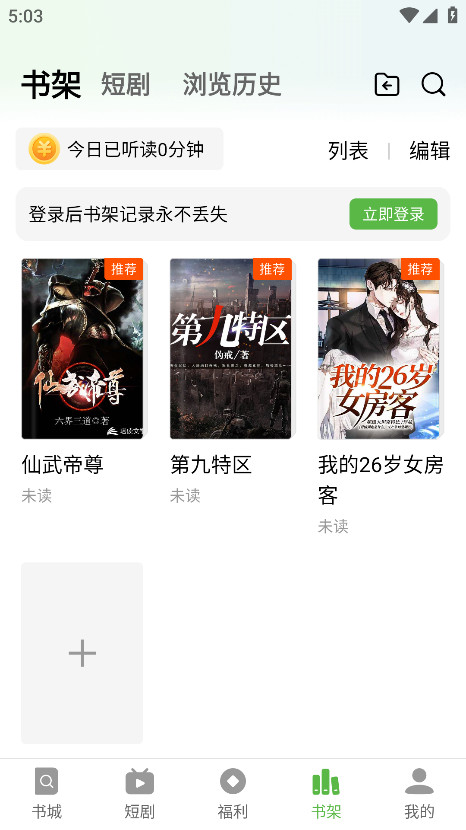 3.点击书架,就可以看得到自己的浏览记录和放入书架的书籍。