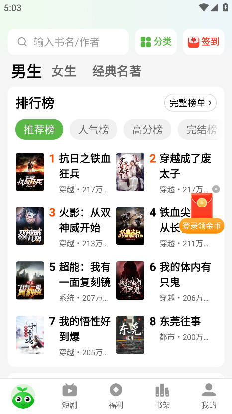 1.打开绿豆免费小说,可以看到首页上方是分为男生、女生、经典名著、推荐榜、人气榜、高分榜等板块内容。