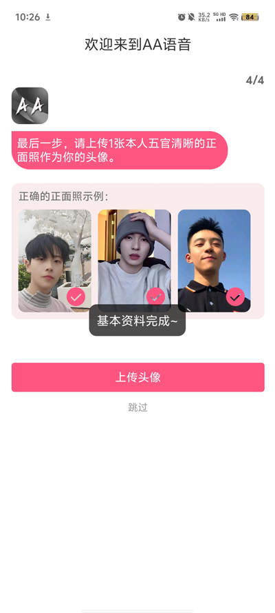 3.进入资料完善最后一步,系统要求上传一张本人五官清晰的正面照作为头像。页面提供正确示例供参考,用户点击“上传头像”按钮完成操作,或选择“跳过”继续使用。