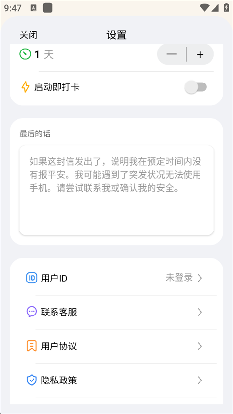 提前设置一位紧急联系人(家人或好友),若连续多日未在应用内签到,系统将于次日自动发送邮件告知对方,及时传递安全异常信号,为潜在风险争取干预时间