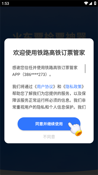 1、阅读用户协议和隐私政策之后点击同意并继续使用;