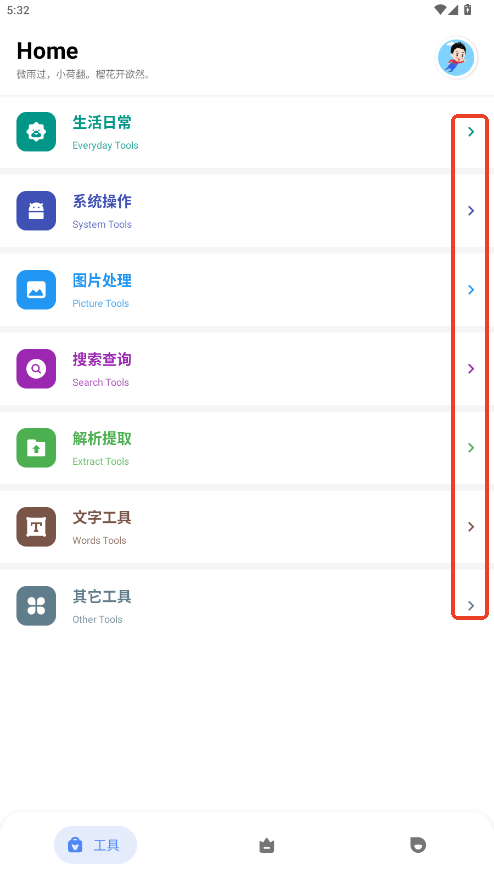 1.打开七点工具箱App,主界面上工具栏显示可折叠的分类,点击分类即可展开相应功能。