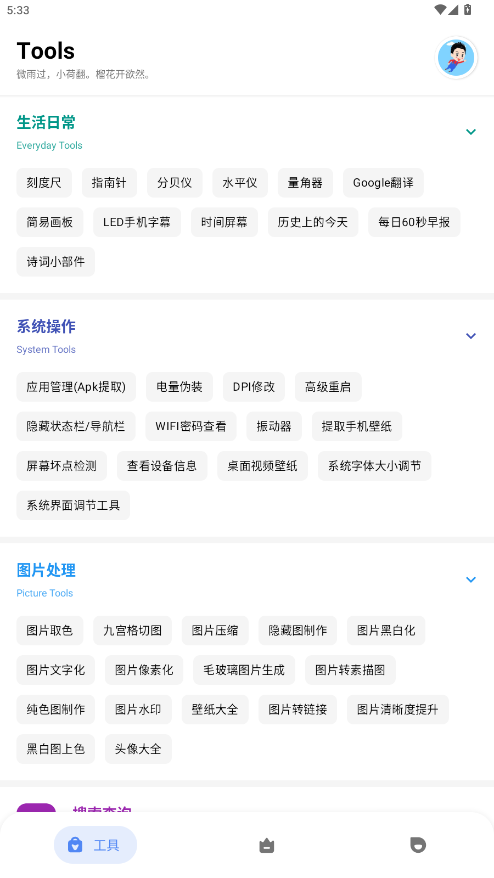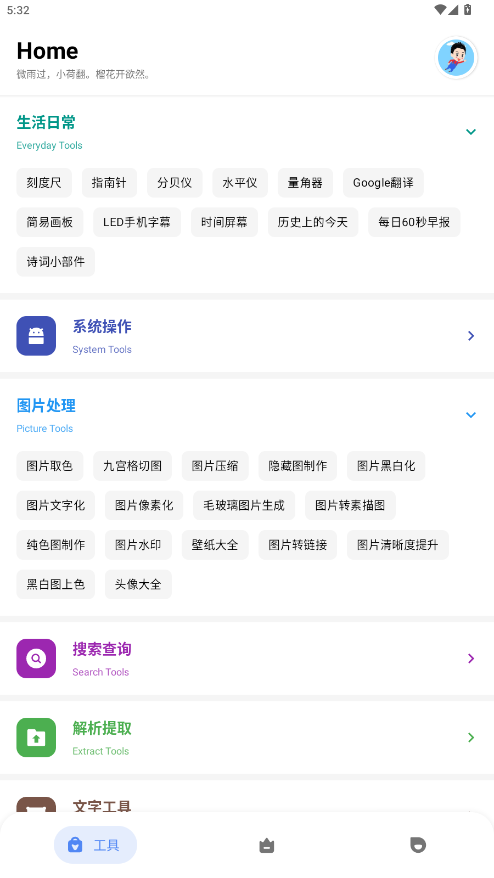 七点工具箱App是一款功能全面的综合性工具软件,集成了生活日常、系统操作、图片处理、搜索查询、解析提取、文字工具等多个实用功能。用户可以通过它轻松处理日常事务,如图片编辑、文字转换、文件解析等,还能快速进行系统优化与查询。无论是处理文件、编辑照片,还是获取实时信息,七点工具箱都能满足你的需求。其简洁的界面和强大的功能使它成为每个安卓用户的必备工具,帮你提高工作与生活效率。