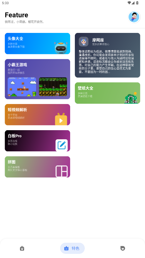 3.特色栏展示了像头像大全、小霸王游戏、短视频解析、星座运势等小工具。点击相应的小工具直接进入使用页面。